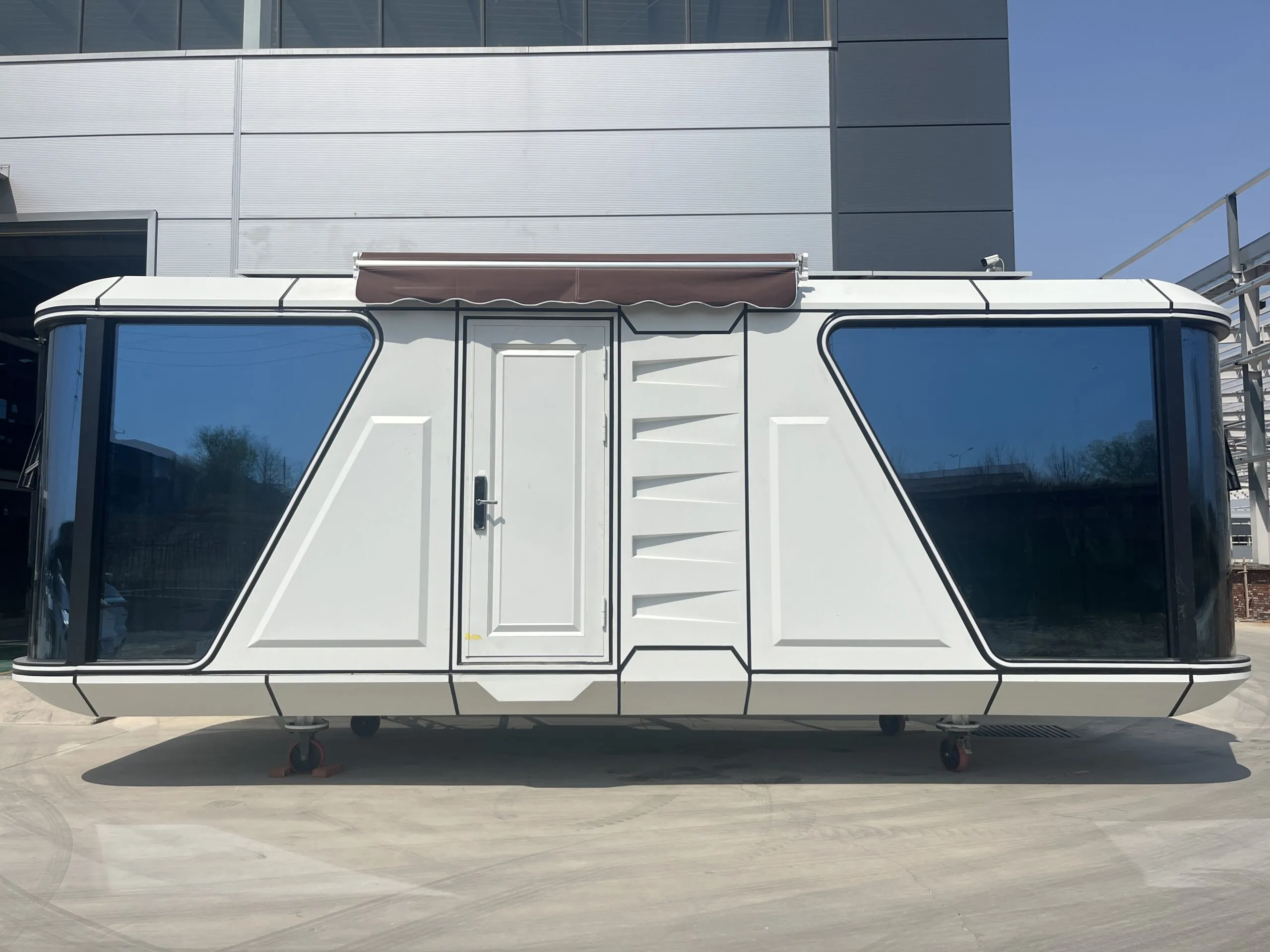 A portable home designed for travelers, featuring compact storage solutions and a sleek design.